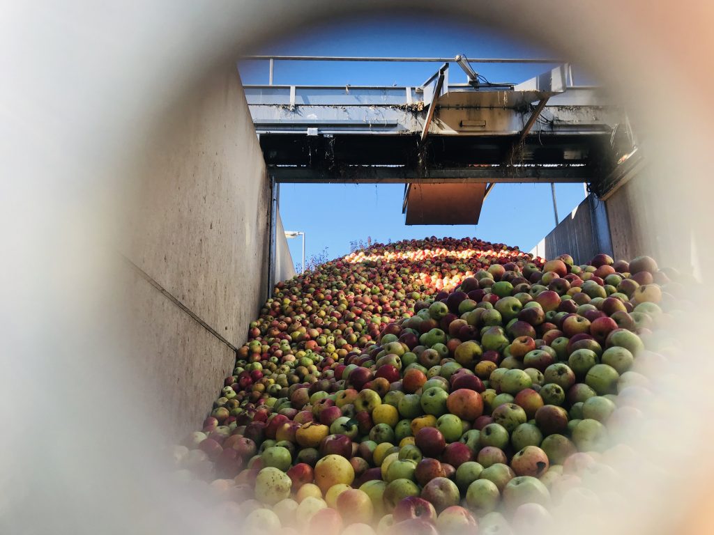 All apples are thoroughly washed, cleaned and sorted for processing. The grinder then produces pulp, which is eventually pressed to achieve the final product of 100% pure apple juice. The juice is then directly transferred into the fermentation tank.